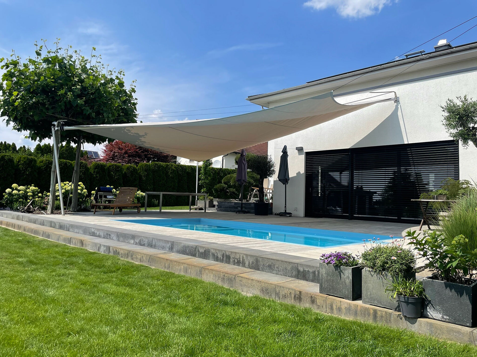 Dank der vielfältigen Konfigurationsmöglichkeiten und der hochqualitativen Fertigung bieten unsere Sonnensegel eine Vielzahl an Vorteilen für unsere Kunden. So können Sie auch Ihre Kinder beim Spielen im Sandkasten oder im Pool vor intensiver UV-Strahlung mit der Überdachung schützen. Die Vielseitigkeit der Segel zeigt sich ebenso in zusätzlichen Funktionen wie der Abdeckung von Pools, Teichen oder Sandkästen, was Verschmutzungen, beispielsweise durch Laubfall, vermindert. Auch für die Industrie eignen sich unsere Sonnensegel: Besonders in der Gastronomie oder zur Beschattung von Kinderspielplätzen sind große Segel ideal. Durch die bedruckbare Fläche auf den Segelsystemen dienen sie nicht nur dem Sonnenschutz, sondern auch als Werbefläche. Den Befestigungsmöglichkeiten sind fast keine Grenzen gesetzt. Wir helfen Ihnen, den bestmöglichen Ort für Ihr Sonnensegel zu finden – unsere Mitarbeiter beraten Sie Vorort gern zu Installationsmöglichkeiten, um den besten Ort für maximalen Sonnenschutz zu finden.