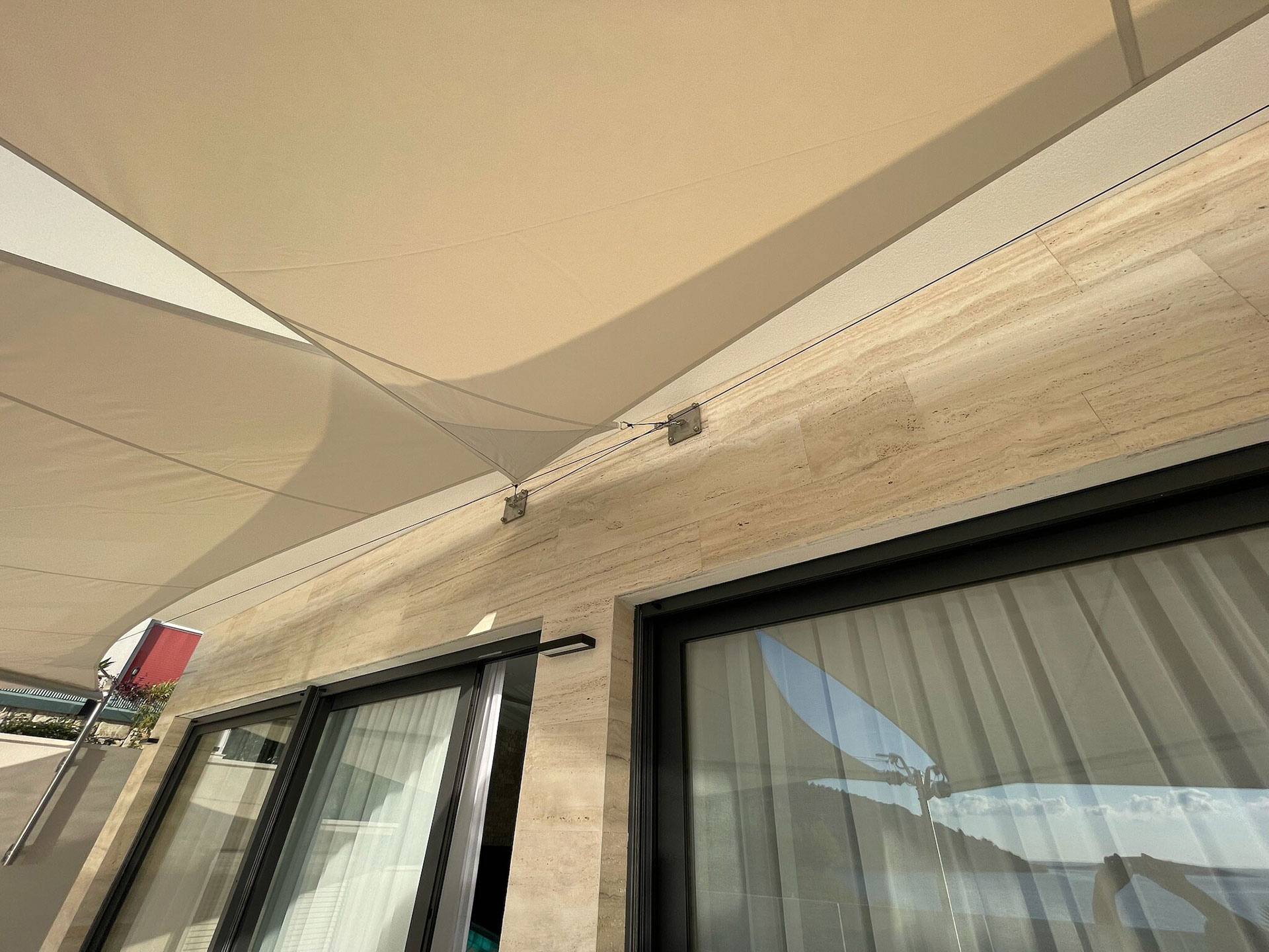 Die Neigung des Sonnensegels sollte ein Mindestgefälle von 15-20° nicht unterschreiten. Alle Gewebearten können horizontal installiert werden, jedoch nur unter der Verwendung von Sonnenschutz.